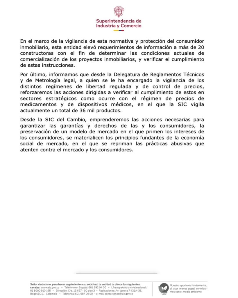 En el caso del sector vivienda, la posición de la SIC resulta aún más delicada. La entidad recuerda la Circular 4 de 2024, vigente desde febrero de 2025, que exige que los precios se publiciten en pesos colombianos y no en salarios mínimos. Esta instrucción es jurídicamente válida y necesaria para garantizar transparencia. Sin embargo, otra cosa muy distinta es insinuar que el valor real de los proyectos no puede ajustarse, cuando los insumos, la mano de obra y la financiación se han encarecido de forma significativa.