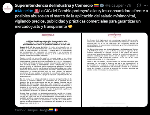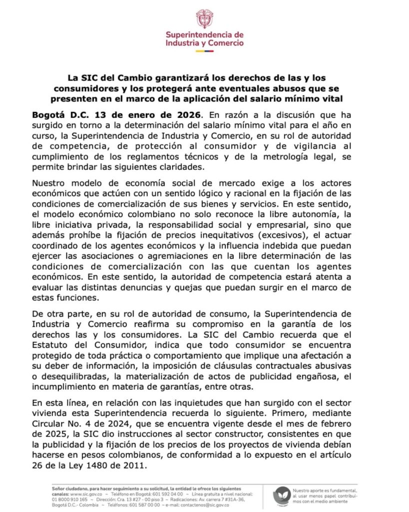 El reciente comunicado de la Superintendencia de Industria y Comercio (SIC), fechado el 13 de enero de 2026, plantea un mensaje que, aunque jurídicamente cuidadoso, resulta económicamente inquietante: la entidad anuncia una vigilancia reforzada para impedir abusos en precios en un contexto en el que el salario mínimo vital ha tenido un incremento histórico del 23 %. La pregunta de fondo no es si la protección al consumidor es legítima —porque lo es—, sino hasta dónde puede llegar la autoridad administrativa sin desdibujar los principios de la economía social de mercado que dice defender.