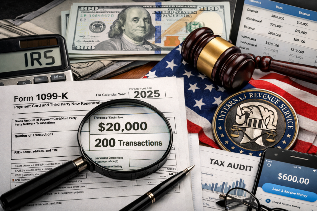La cifra US$20.000 + 200 transacciones es la marca histórica del Form 1099-K, el formulario informativo que emiten plataformas de pago y marketplaces (p. ej., aplicaciones de pago y ventas en línea) cuando una persona recibe pagos por bienes o servicios por encima de ese umbral. El propio IRS lo explica en su guía para contribuyentes: las TPSO (Third Party Settlement Organizations) deben reportar en 1099-K cuando el total de pagos por bienes/servicios supera US$20.000 y hay más de 200 transacciones.
