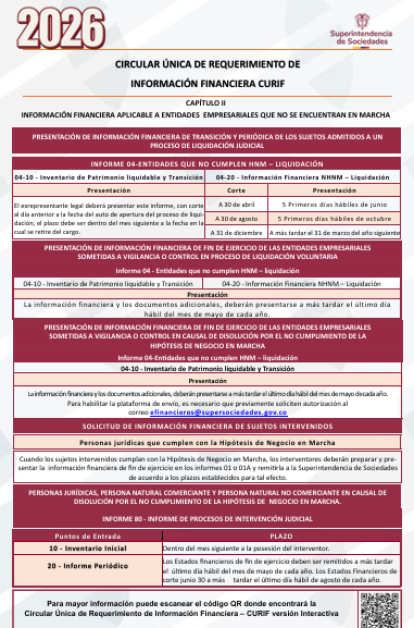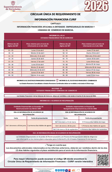 La Superintendencia de Sociedades publicó el calendario oficial para la presentación de la información financiera correspondiente al ejercicio con corte a 31 de diciembre de 2025, el cual deberá ser reportado durante el año 2026 a través de la Circular Única de Requerimiento de Información Financiera (CURIF).